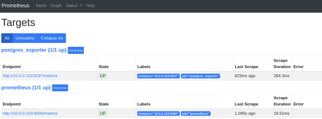 - Hidupkan Postgres_exporter service dan pastikan layanan target telah disetel ke “UP” di UI web Prometheus.
