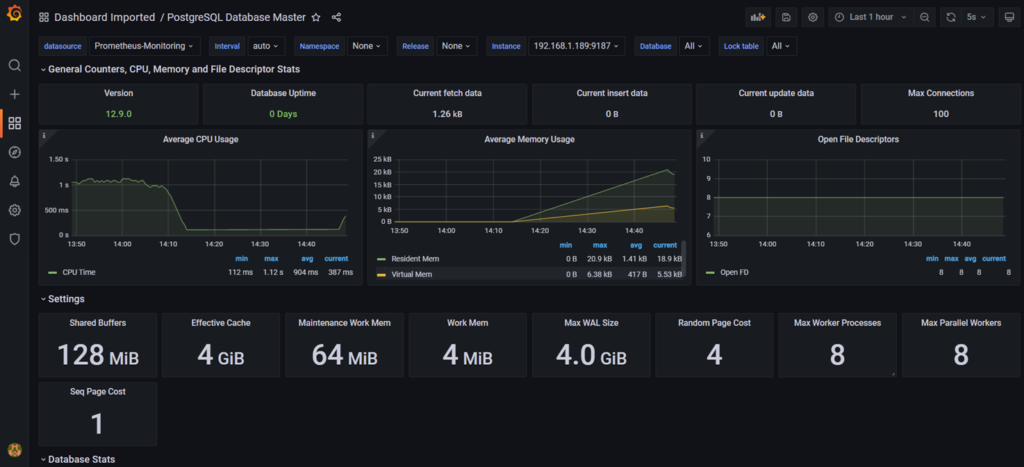 - Setelah memilih dashboard yang akan dipantau di manajemen dashboard, sekarang kita dapat melihat dashboard untuk memantau server database PostgreSQL kita yang berisi sumber daya sistem dan pemantauan database.