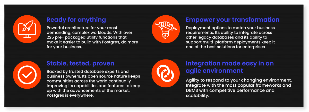 As the world constantly innovates and scales, EDB offers an integrated portfolio of databases and tools that extend PostgreSQL for enterprise workloads, featuring world-class support.