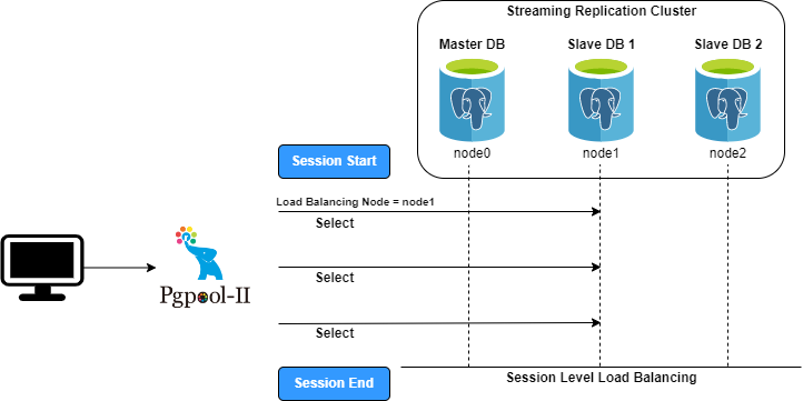 Secara default, mode distribusi beban di Pgpool-II adalah “Session Level.” Artinya, permintaan baca node yang dikirim ditentukan saat client pertama kali terkoneksi ke Pgpool-II. Misalnya, jika ada node 0 dan node 1, maka setiap session baru akan memilih salah satu node secara acak. Dalam jangka panjang, probabilitas pemilihan node akan mengikuti rasio yang ditentukan oleh backend_weight0 dan backend_weight1. Jika kedua nilai tersebut sama, maka peluang setiap node untuk terpilih juga akan sama besar.